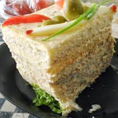 Coloque 10 fatias de pão de forma na base arrumadas em 2 fileiras de 5 fatias e vá fazendo as camadas, primeiro com o patê de azeitonas, na segunda camada com o frango desfiado e a terceira, com o patê de tomate seco.